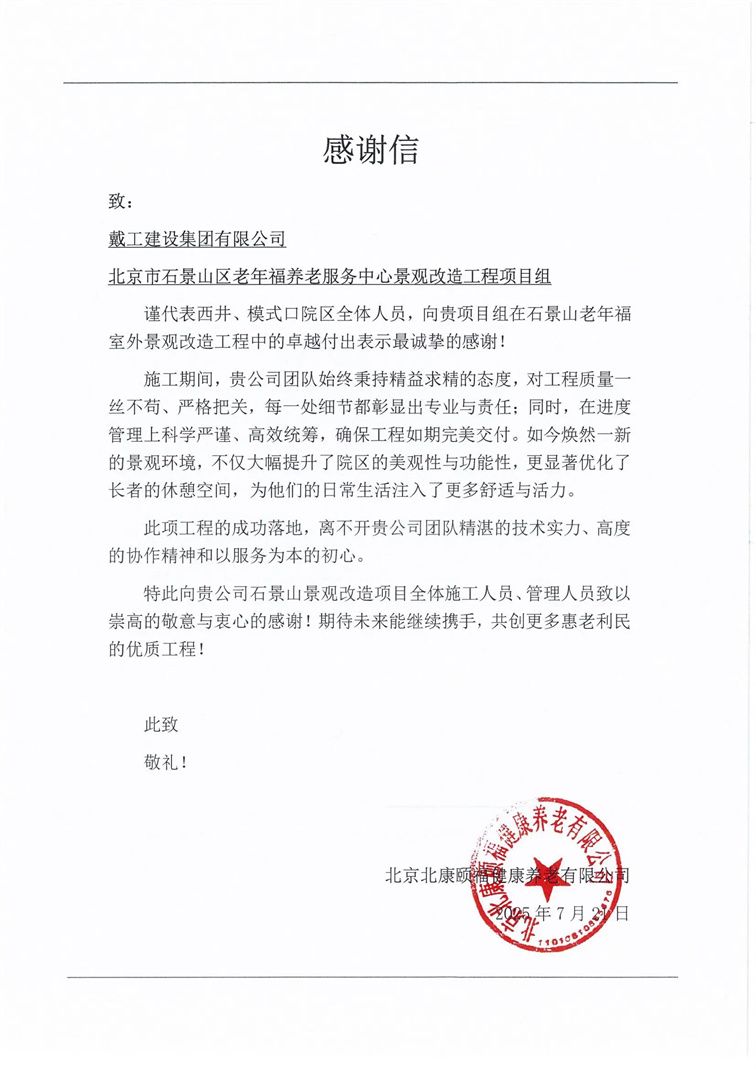 工程竣工后,石景山區(qū)老年福養(yǎng)老服務(wù)中心整體環(huán)境煥然一新。新建景觀區(qū)域在提升視覺美感的同時,顯著拓展了長者的休閑活動空間。養(yǎng)老中心負(fù)責(zé)人表示:"戴工建設(shè)集團的卓越工作使養(yǎng)老環(huán)境實現(xiàn)質(zhì)的飛躍。其對工程質(zhì)量的嚴(yán)苛要求與按期交付的專業(yè)素養(yǎng)令人欽佩。為此,養(yǎng)老中心特向戴工建設(shè)集團致送感謝信以表誠摯謝忱。